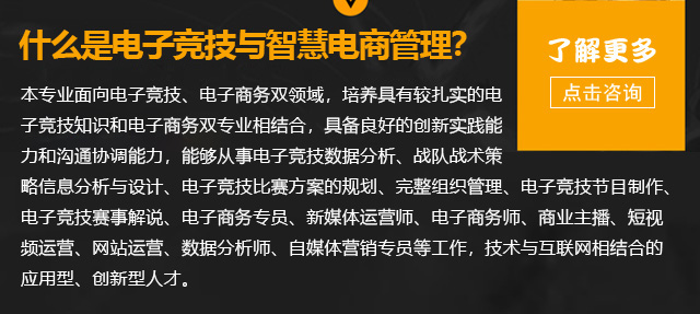 通過本專業(yè)的系統(tǒng)學習,畢業(yè)后可擔任的職位有電子競技數(shù)據(jù)分析、戰(zhàn)隊戰(zhàn)術(shù)策略信息分析與設計、電子競技比賽方案的規(guī)劃、電子競技賽事解說、電子商務專員、新媒體運營師、電子商務師、商業(yè)主播、短視頻運營、網(wǎng)站運營、數(shù)據(jù)分析師等。