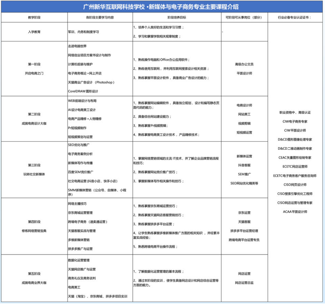 培養(yǎng)目標:隨著流量時代的到來,新媒體與電子商務的融合正在進一步提速,既懂流量,又會電商的復合型、創(chuàng)新型人才出現(xiàn)明顯缺口。廣州新華互聯(lián)網(wǎng)科技學校領先全國,推出新媒體與電子商務運營專業(yè),旨在培養(yǎng)新媒體和電商結(jié)合的復合型、創(chuàng)新型人才。